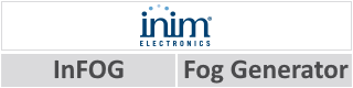 Generador de boira amb bomba Inim InFOG-C100 equipat amb interfície I-BUS i Air2 (requereix firmware BS200 6.30 o posterior) per a connexió directa de bus de dades amb panells de control d'intrusió Prime i PrimeX (firmware 4.05 o posterior). Capacitat total d'emissió amb boira plena: 780 m³. Sortida màxima d'un sol tret de boira 130 m³. Quantitat de fluid a la bossa (no inclosa): 500 ml. Font d'alimentació: 230 Vca. Compartiment de bateries per a 2 bateries de 12 Vcc/1,2 Ah (no incloses).