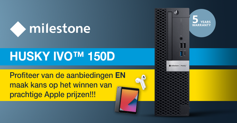 Milestone heeft eerder dit jaar de geavanceerde Husky IVO hardware range geïntroduceerd! Deze range besttaat uit zes verschillende modellen vervaardigd door Dell en geoptimaliseerd voor Milestone XProtect VMS. Ze worden geleverd met een hardware garantie van vijf jaar en on-site support op de volgende werkdag! Laat nu je gegevens achter en ontvang de Husky IVO 150D promotie prijzen en maak direct kans op de nieuwste Apple iPad of Apple AirPods!