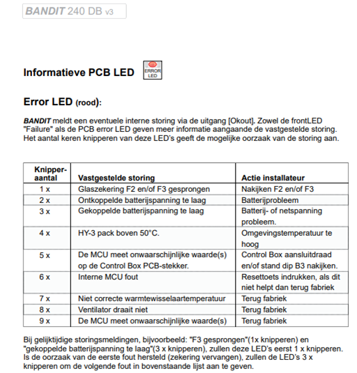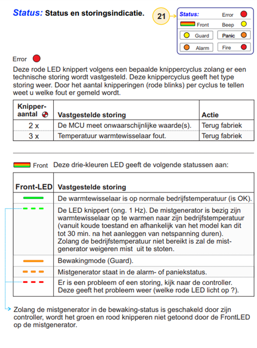 - In geval van een defect bij een BANDIT 240 of BANDIT 320 mistgenerator moet ook de foutcode worden meegedeeld aan de hand van de status van de storingsindicatie op het toestel (Error LED)